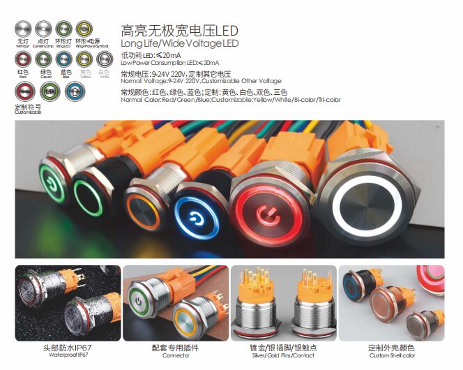 Mainlydevelopandmanufacturehigh-endmetalbuttonswitches,relays, indicatorlights,emergency stopswitch, key switch, knob,buzzer,rocker switch,touchswitchandotherproducts,withhighcurrent,light,waterproof,dustproof,explosion-proofandotherfunctions,Customdevelopmentispossible.